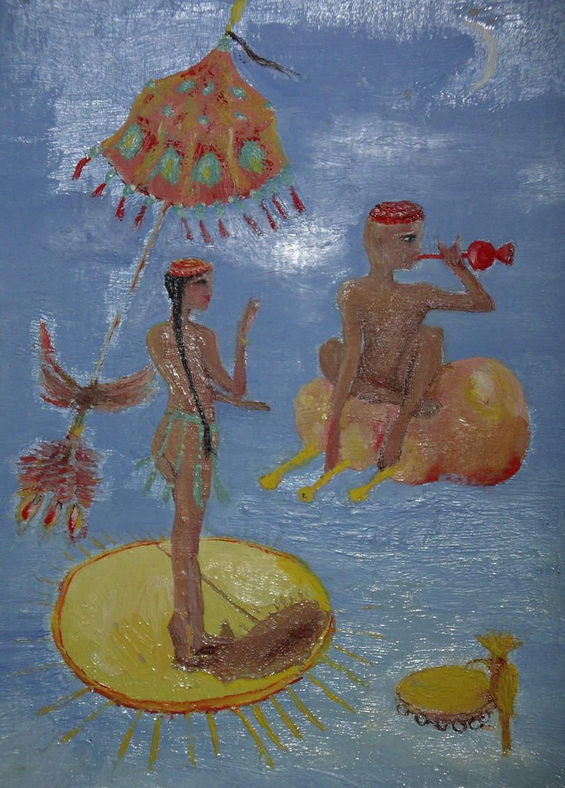 Auf dem Hintergrund sind die Berge mit Felszeichnungen, im Zentrum des Bildes tanzt ein Tänzer auf den Blasrohren. In seinem Inneren